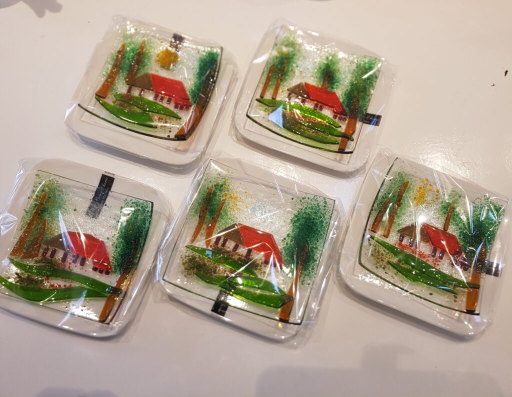 Gepersonaliseerde schaaltjes van 12 x 12 cm, in opdracht van de gemeente Tubbergen waarin Twentse huisjes zijn afgebeeld.