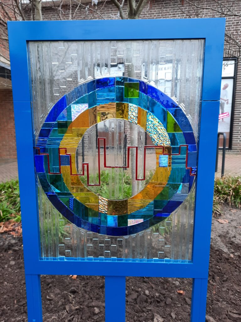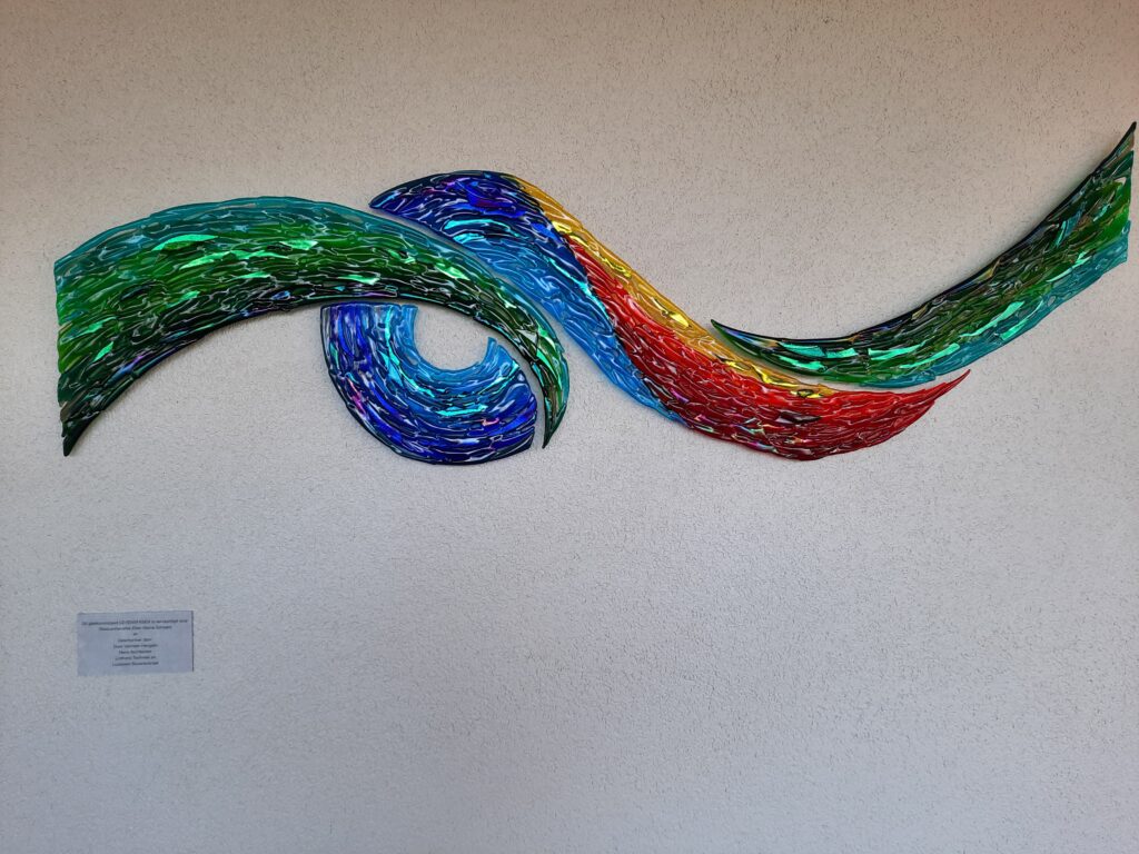 De kleuren van het kunstobject is afgestemd op de kleuren van het Gezondheidscentrum.