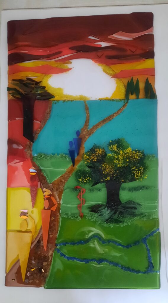 Voor afscheid van een dokter die ook zijn jaren in Tanzania heeft doorgebracht, ontworp ik dit beeld dat symbool staat voor zijn levenspad. De Boabtree, Afrikaanse dames, Italiaanse cipressen en de Rotterdamse waal zijn verwerkt in het object zodat het helemaal aansloot op de levensloop van de desbetreffende dokter.