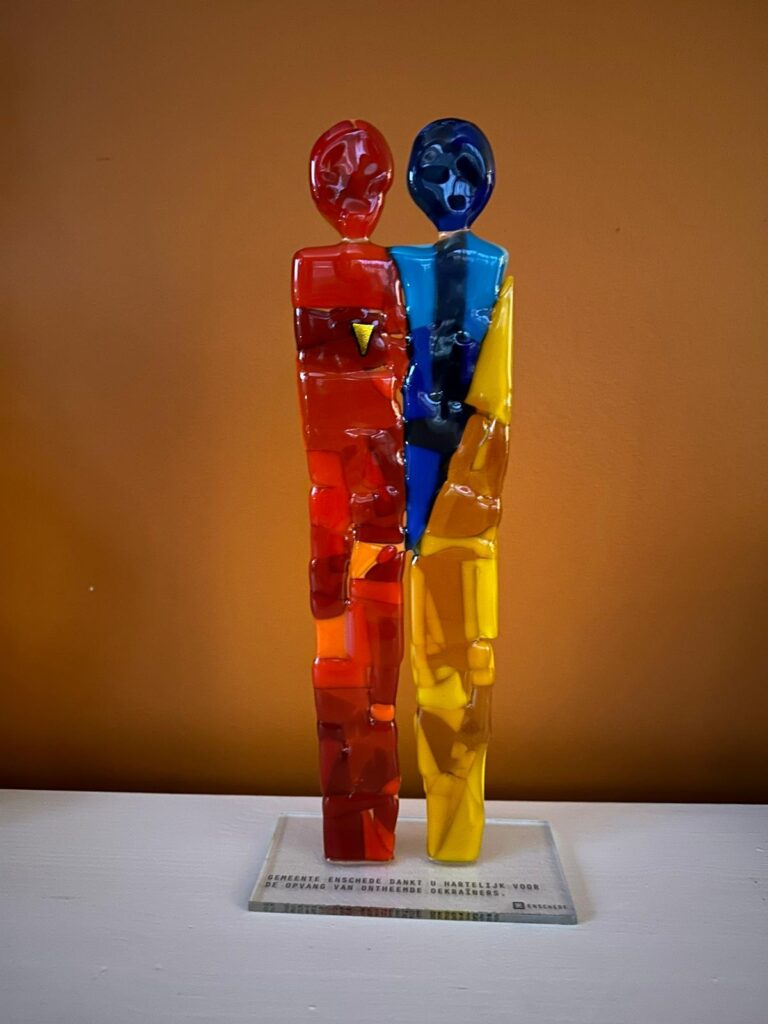 Dit beeldje is gemaakt voor alle vrijwilligers die hulp hebben verleend bij het opvangen van Oekraïense vluchtelingen. Het staat symbool voor het schouder-aan-schouder staan tussen de Nederlandse hulpverlener de Oekraïense vluchteling.