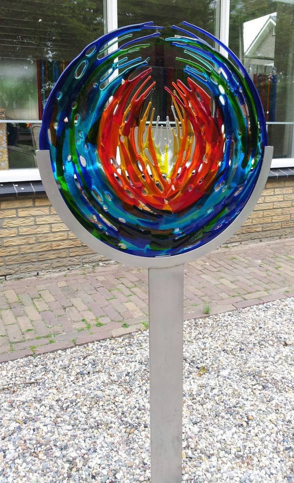 Dit object heeft een prachtige lotus vorm en is geschikt door de solide rvs sokkel om in de tuin te zetten. Uiteraard ook als wandpaneel aan te schaffen. Afmeting 60 cm doorsnede. 795,00/excl. Sokkel Gezien de grootte zal het object bezorgd worden (meerprijs afhankelijk van reiskosten)